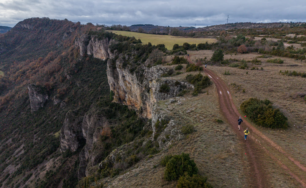Dans un premier temps, il s’agit de contourner les falaises de Roquesquatres, soit une longue piste parfois humide avec 100 m de D+ comme mise en jambes pour rejoindre le plateau du Larzac avec passage aux rochers et chaos de Roucangel, une bel alignement de petites falaises taraudées par le temps dominant la vallée. On récupère dans une longue partie, cap plein Est, par un sentier caussenard cheminant en douceur, en limite de rupture de pente jusqu’à trouver le sentier technique dévalant ce flanc de causse pour rejoindre l’ancienne gare de Labastide Pradines où est jugé le premier ravitaillement. La course débute vraiment ici par une remontée sur le causse, là on est dans l’esprit Templiers, c’est technique, c’est tortueux, ça dévale, ça grimpe et l’on rejoint Lapanouse de Cernon par d’anciens sentiers de bergers.